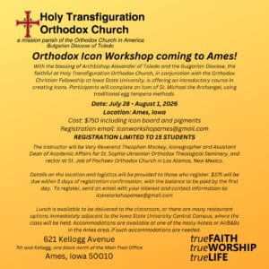 With the blessing of Archbishop Alexander of Toledo and the Bulgarian Diocese, the faithful at Holy Transfiguration Orthodox Church, in conjunction with the Orthodox Christian Fellowship at Iowa State University, is offering an introductory course in creating Icons. Participants will complete an Icon of St. Michael the Archangel, using traditional egg tempera methods.